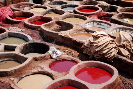 Fez's tanneries are composed of numerous stone vessels filled with a vast range of dyes and various liquids spread out like a tray of watercolors.